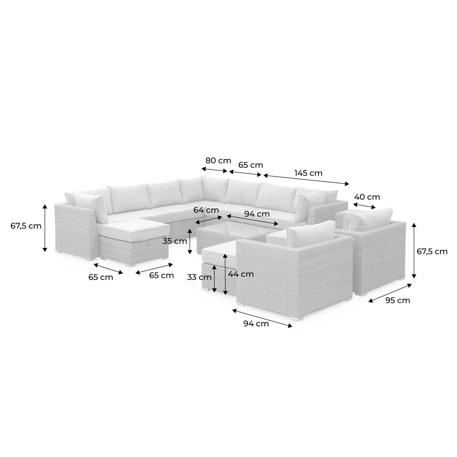 The Verona sofa set is ideal for any large terrace or conservatory. It can accommodate up to 14 people, with plenty of room for larger family gatherings and groups of friends. The Verona sofa set has angled armrests that create V-shaped seats, giving it a trendy and contemporary look as well as a more contoured feel. The cushions have a polished finish, thanks to their braided edges, and the sofa is extra-comfy with 10cm wide armrests and backrests, and spacious 65 x 65cm seats. The seat cushions are 14cm thick, the backrests are 18cm thick, and the fabric is soft and pleasant to the touch, made from dense 270g/m² polyester.