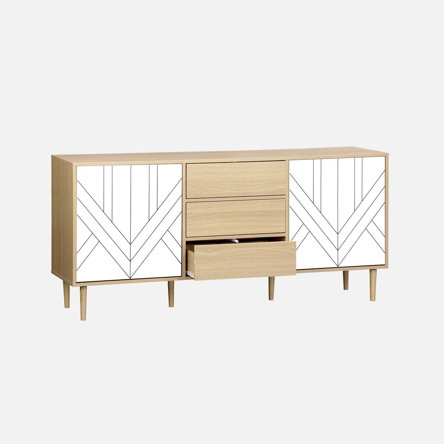 As well as being refined, this sideboard is functional: with its 2 doors and 3 drawers fitted with the push system, it offers you spacious and secure storage space. Inside, its 2 levels give you optimum storage space for your crockery, glasses, table linen, etc. The shelves can be placed at 3 different heights to suit your needs. Its 6 pinewood legs (including 2 central ones) give it solidity and stability .