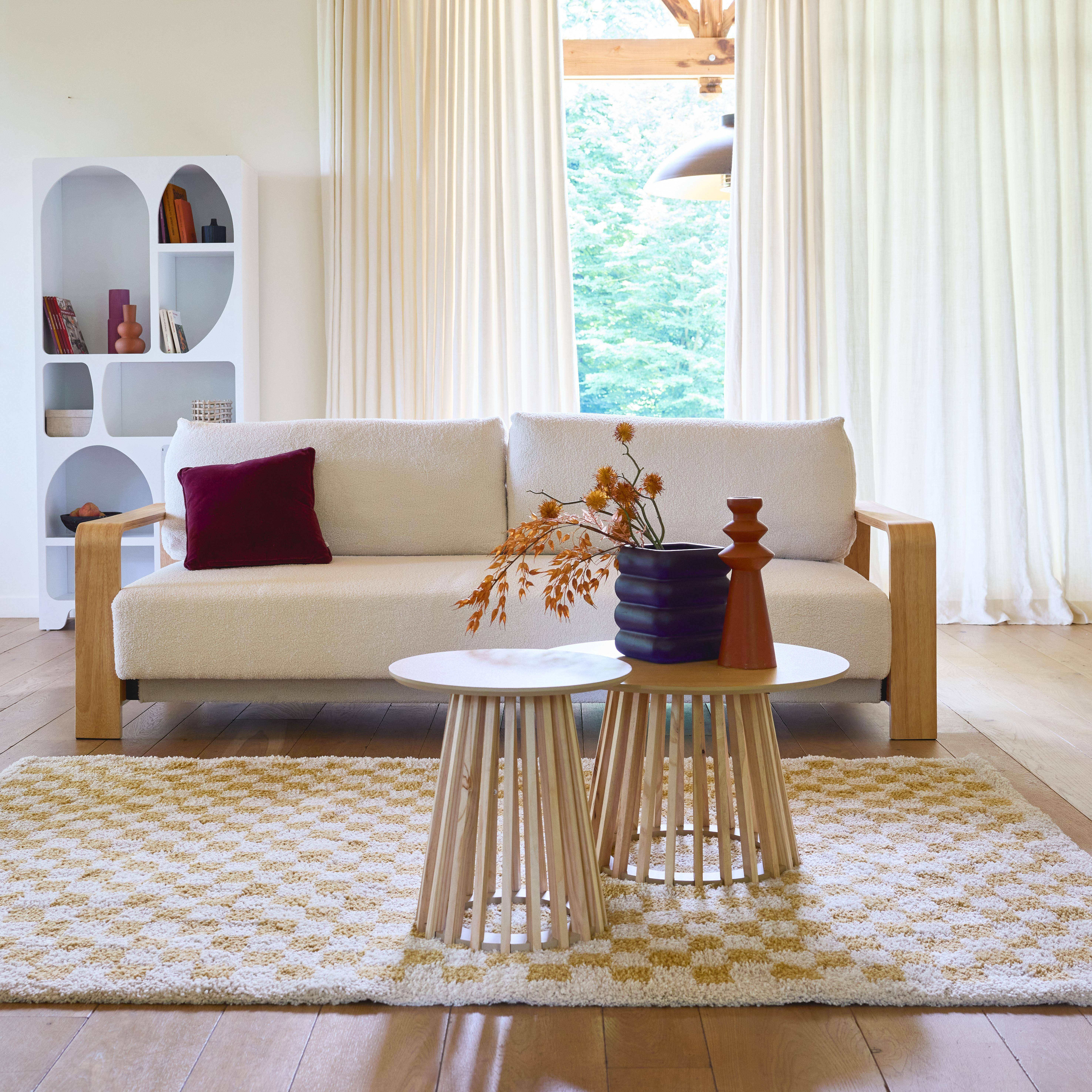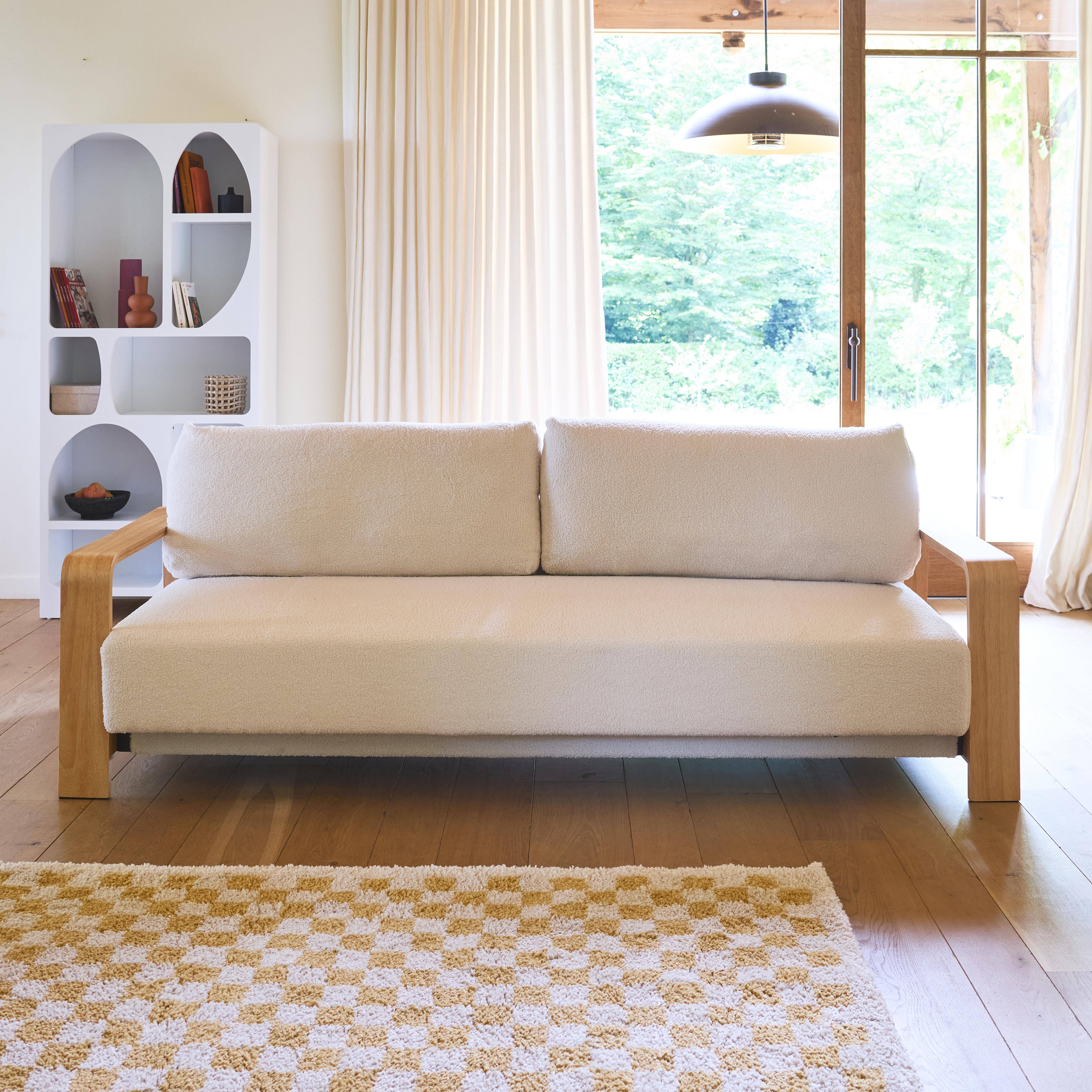 3-seater sofa bed in white boucle with wooden armrests