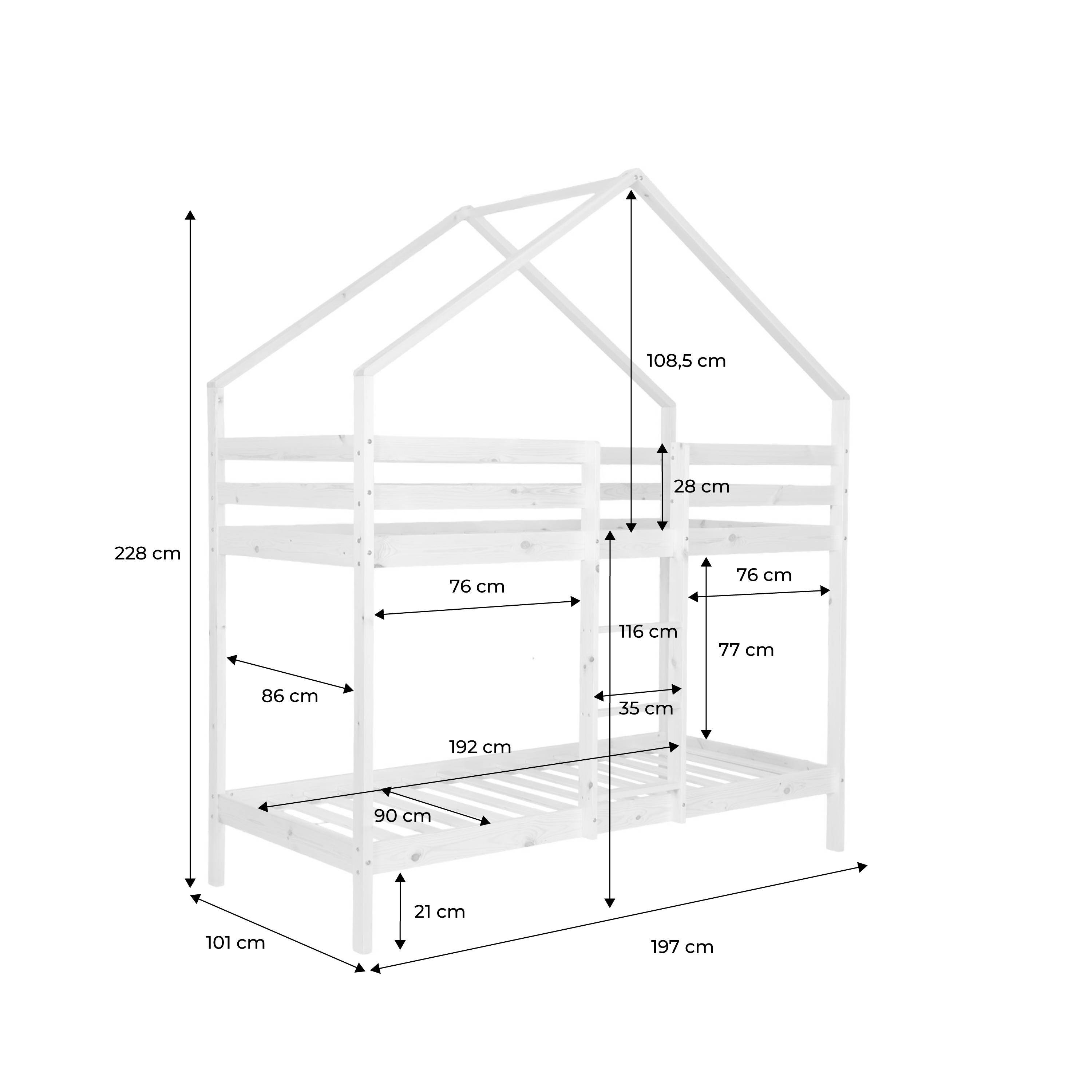 The Roya bunk bed brings a real touch of magic to children's bedrooms. Its Scandinavian style in natural pine creates a soft and comforting atmosphere, perfect for creating a space to grow well. Shaped like a little house, it quickly becomes their favorite playground: Add some string lights on the roof, and imagination will do the rest. Clever and full of charm, the Roya bed is equipped with spaces under the lower bed to add drawers and avoid cluttering the room. The ladder, simple and stable, leads to the upper bed, perched just high enough to dream a little higher. A warm, practical, and poetic piece of furniture that puts stars in children's eyes and a big smile on parents' faces.