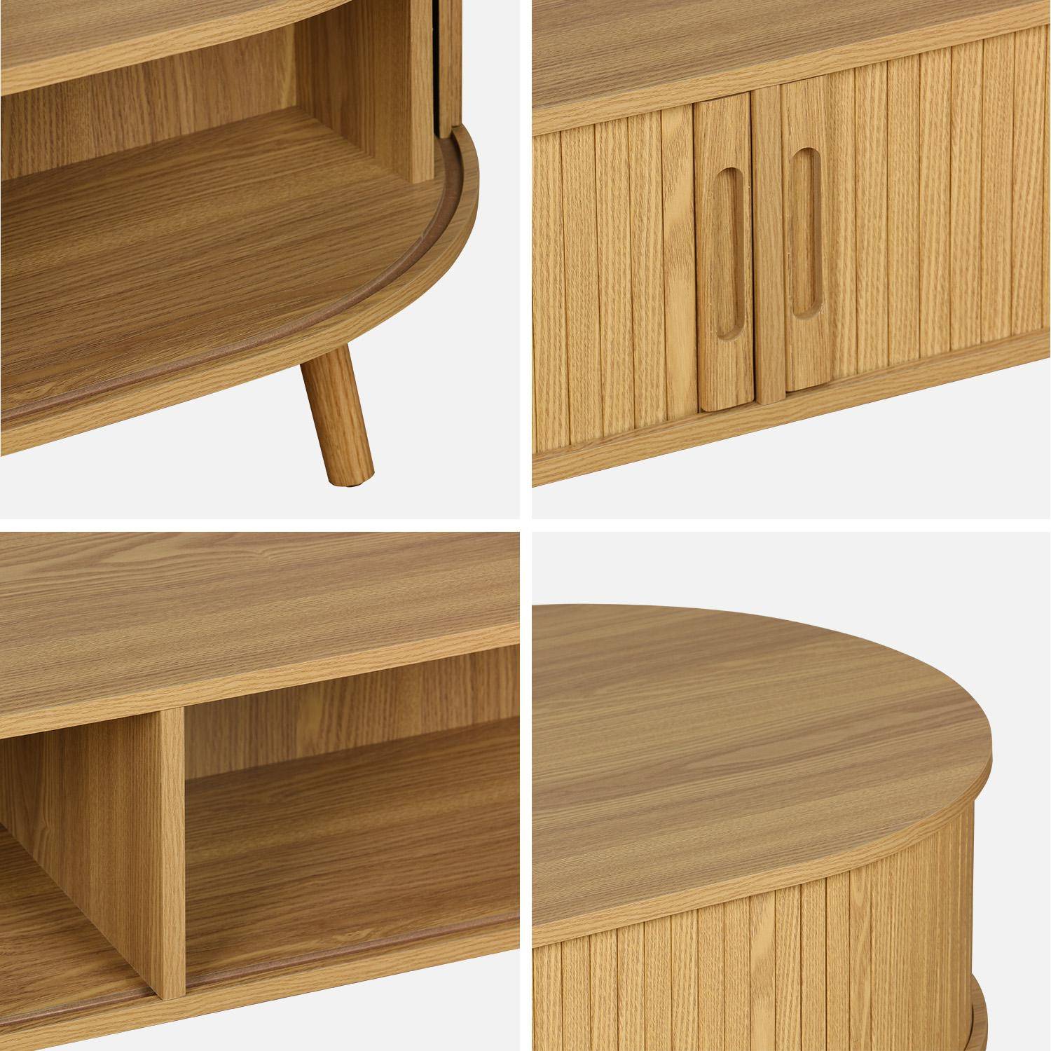 Coffee table with sliding doors and grooved wooden-effect compartments